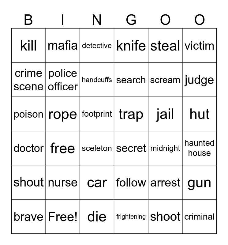 This bingo card has 38 words: gun, arrest, criminal, crime scene, free, jail, police officer, shoot, steal, handcuffs, judge, knife, poison, footprint, victim, trap, car, detective, Free!, rope, kill, secret, search, sceleton, die, midnight, shout, frightening, brave, follow, catch, hut, haunted house, mafia, nurse, doctor, scream and escape.