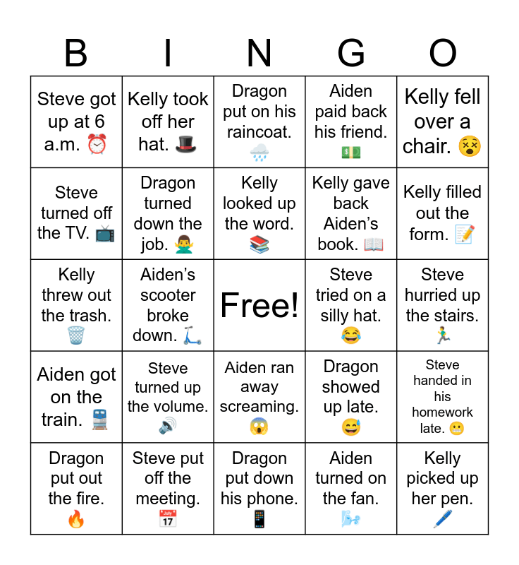 This bingo card has a free space and 28 words: Steve handed in his homework late. ๐ฌ, Dragon handed out candy to the class. ๐ฌ, Kelly gave back Aidenโs book. ๐, Aiden turned on the fan. ๐ฌ๏ธ, Steve turned off the TV. ๐บ, Dragon put on his raincoat. ๐ง๏ธ, Kelly took off her hat. ๐ฉ, Aiden got on the train. ๐, Steve tried on a silly hat. ๐, Dragon put out the fire. ๐ฅ, Kelly threw out the trash. ๐๏ธ, Aiden paid back his friend. ๐ต, Steve put off the meeting. ๐ , Dragon put down his phone. ๐ฑ, Kelly filled out the form. ๐, Aiden found out the truth. ๐ฎ, Steve turned up the volume. ๐, Dragon turned down the job. ๐ โโ๏ธ, Kelly looked up the word. ๐, Aiden ran away screaming. ๐ฑ, Steve got up at 6 a.m. โฐ, Dragon went out for dinner. ๐, Kelly picked up her pen. ๐๏ธ, Aidenโs scooter broke down. ๐ด, Steve hurried up the stairs. ๐โโ๏ธ, Dragon showed up late. ๐ , Kelly fell over a chair. ๐ต and Aidenโs hamster passed away. ๐น๐.