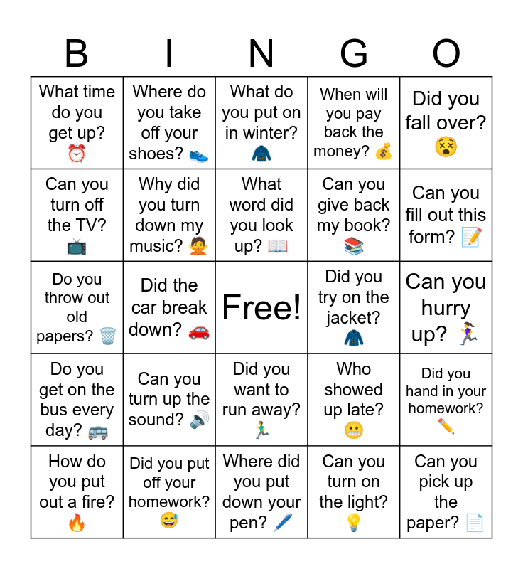 This bingo card has a free space and 28 words: Did you hand in your homework? βοΈ, Who hands out the snacks? πͺ, Can you give back my book? π, Can you turn on the light? π‘, Can you turn off the TV? πΊ, What do you put on in winter? π§₯, Where do you take off your shoes? π, Do you get on the bus every day? π, Did you try on the jacket? π§₯, How do you put out a fire? π₯, Do you throw out old papers? ποΈ, When will you pay back the money? π°, Did you put off your homework? π , Where did you put down your pen? ποΈ, Can you fill out this form? π, What did you find out? π€, Can you turn up the sound? π, Why did you turn down my music? π , What word did you look up? π, Did you want to run away? πββοΈ, What time do you get up? β°, Do you go out on Saturdays? π, Can you pick up the paper? π, Did the car break down? π, Can you hurry up? πββοΈ, Who showed up late? π¬, Did you fall over? π΅ and Did your pet pass away? πΎπ.