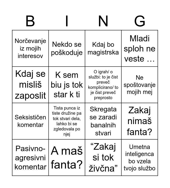This bingo card has 16 words: A maš fanta?, Zakaj nimaš fanta?, Kdaj bo magistrska, Norčevanje iz mojih interesov, Seksističen komentar, Nekdo se poškoduje, Skregata se zaradi banalnih stvari, “Zakaj si tok živčna”, Kdaj se misliš zaposlit, K sem biu js tok star k ti, Pasivno-agresivni komentar, Mladi sploh ne veste …, Tista punca iz tiste družine pa tok stvari dela, lahko bi se zgledovala po njej, Ne spoštovanje mojih mej, O igrah/ o službi: to je čist preveč komplicirano/ to je čist preveč preprosto and Umetna inteligenca bo vzela tvojo službo.