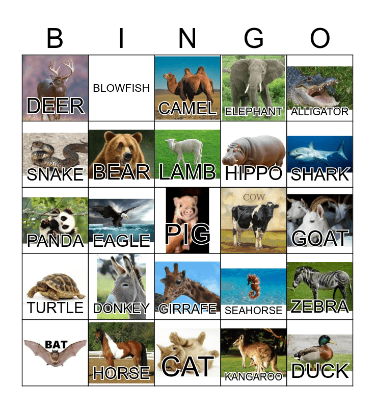 This bingo card has 38 images and 38 words: BLOWFISH, PANDA, TIGER, BEAR, HORSE, GIRRAFE, LAMB, LION, ALLIGATOR, TURTLE, EAGLE, ELEPHANT, PIG, GOAT, DONKEY, FOX, DEER, MONKEY, CAMEL, ZEBRA, KANGAROO, HIPPO, SNAKE, STARFISH, PEACOCK, ROSTER, TURTLE, DUCK, CORAL REEF, TURKEY, FROG, SEAHORSE, SHARK, CAT, DOG, RABBIT, BLOWFISH and BLOWFISH.