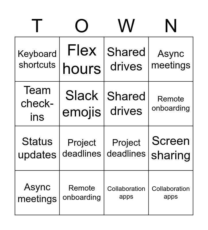 This bingo card has 114 words: Virtual coffee, Free!, Virtual coffee, Cloud storage, Team building, Stable connection, Async meetings, Remote onboarding, Status updates, Shared drives, Keyboard shortcuts, Video calls, Home office setup, Flex hours, Slack emojis, Ergonomic chair, Weekly huddles, Time tracking, Headphones on, Team check-ins, Status updates, Shared drives, Ergonomic chair, Weekly huddles, Flex hours, Collaboration apps, Time tracking, Work-life balance, Task board, Coworking tools, Project deadlines, Remote onboarding, Screen sharing, Break time, Async meetings, Coworking tools, Keyboard shortcuts, Remote onboarding, Stable connection, Break time, Cloud storage, Time tracking, Video calls, Screen sharing, Work-life balance, Project deadlines, Home office setup, Slack emojis, Team building, Task prioritization, Screen sharing, Remote onboarding, Ergonomic chair, Keyboard shortcuts, Coworking tools, Project deadlines, Home office setup, Time tracking, Slack emojis, Weekly huddles, Team check-ins, Status updates, Break time, Cloud storage, Virtual coffee, Flex hours, Video calls, Shared drives, Project deadlines, Slack emojis, Collaboration apps, Task board, Team check-ins, Ergonomic chair, Time tracking, Async meetings, Cloud storage, Keyboard shortcuts, Team building, Screen sharing, Home office setup, Flex hours, Coworking tools, Weekly huddles, Status updates, Collaboration apps, Break time, Async meetings, Task prioritization, Ergonomic chair, Home office setup, Slack emojis, Project deadlines, Team check-ins, Remote onboarding, Keyboard shortcuts, Time tracking, Flex hours, Home office setup, Coworking tools, Weekly huddles, Task board, Time tracking, Video calls, Slack emojis, Cloud storage, Project deadlines, Team building, Collaboration apps, Break time, Status updates, Ergonomic chair, Async meetings and Team check-ins.