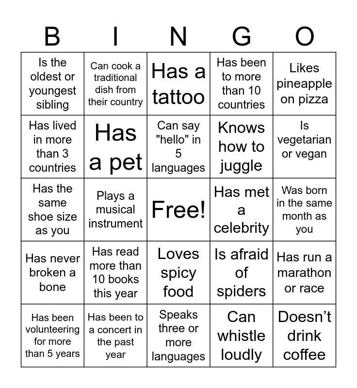This bingo card has a free space and 24 words: Has read more than 10 books this year, Has been to a concert in the past year, Can say "hello" in 5 languages, Has been volunteering for more than 5 years, Likes pineapple on pizza, Is the oldest or youngest sibling, Has lived in more than 3 countries, Can cook a traditional dish from their country, Has met a celebrity, Loves spicy food, Knows how to juggle, Has the same shoe size as you, Is afraid of spiders, Has run a marathon or race, Has a pet, Can whistle loudly, Was born in the same month as you, Has a tattoo, Is vegetarian or vegan, Plays a musical instrument, Doesn’t drink coffee, Has never broken a bone, Has been to more than 10 countries and Speaks three or more languages.