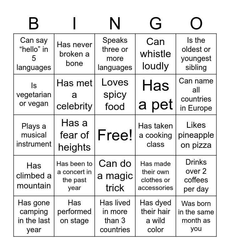 This bingo card has a free space and 24 words: Has been to a concert in the past year, Has performed on stage, Loves spicy food, Has gone camping in the last year, Is the oldest or youngest sibling, Can say “hello” in 5 languages, Is vegetarian or vegan, Has never broken a bone, Has taken a cooking class, Can do a magic trick, Has a pet, Plays a musical instrument, Has made their own clothes or accessories, Drinks over 2 coffees per day, Has met a celebrity, Has dyed their hair a wild color, Likes pineapple on pizza, Speaks three or more languages, Can name all countries in Europe, Has a fear of heights, Was born in the same month as you, Has climbed a mountain, Can whistle loudly and Has lived in more than 3 countries.
