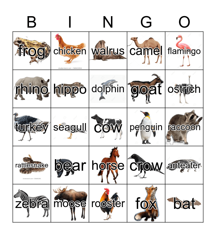 This bingo card has 49 images, a free space and 49 words: donkey, bat, bee, rooster, bear, sheep, chicken, lion, rhino, elephant, hippo, camel, anteater, crow, deer, dog, dolphin, penguin, eagle, flamingo, seagull, fox, frog, goat, goose, ostrich, zebra, hyena, horse, rattlesnake, killer whale, duck, crocodile, chimp, moose, owl, pig, peacock, raccoon, mouse, otter, seal, squirrel, swan, turkey, walrus, wolf, cricket and beaver.