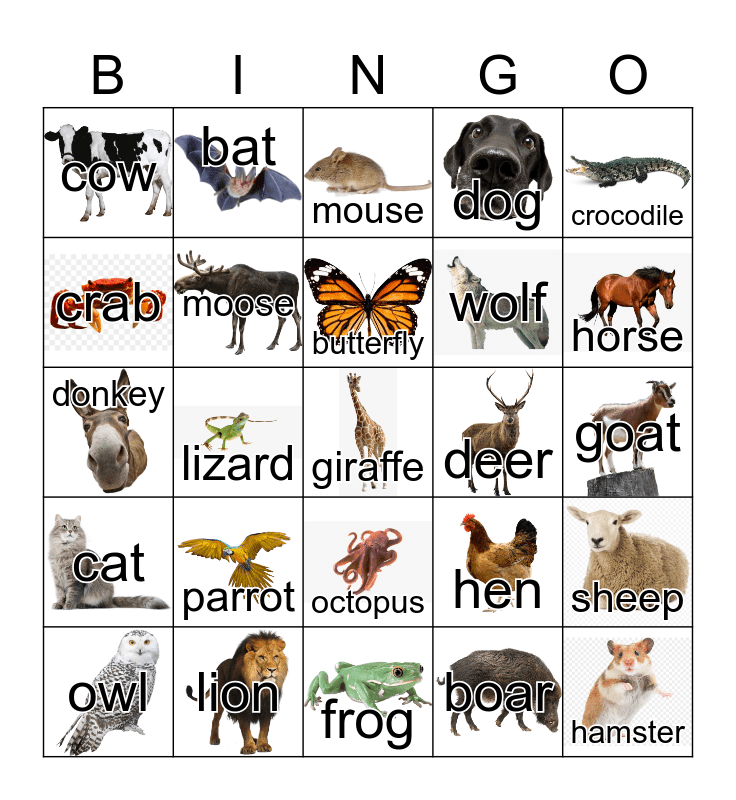 This bingo card has 58 images and 58 words: bear, lion, hedgehog, cat, boar, fox, moose, squirrel, wolf, bird, dog, rabbit, zebra, hippopotamus, tiger, cow, giraffe, crocodile, fish, butterfly, deer, mouse, owl, sheep, chicken, goat, duck, pig, horse, turkey, rhino, elephant, monkey, dolphin, shark, snake, spider, lizard, donkey, koala, parrot, hamster, hen, gorilla, goose, cheetah, sloth, octopus, frog, panda, camel, kangaroo, flamingo, whale, bat, panther, crab and penguin.