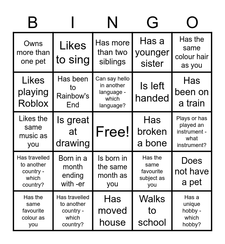 This bingo card has a free space and 24 words: Born in a month ending with -er, Has travelled to another country - which country?, Can say hello in another language - which language?, Has the same favourite colour as you, Has the same colour hair as you, Owns more than one pet, Likes playing Roblox, Likes to sing, Has broken a bone, Is born in the same month as you, Is left handed, Likes the same music as you, Has the same favourite subject as you, Does not have a pet, Has been to Rainbow's End, Walks to school, Plays or has played an instrument - what instrument?, Has more than two siblings, Has been on a train, Is great at drawing, Has a unique hobby - which hobby?, Has travelled to another country - which country?, Has a younger sister and Has moved house.