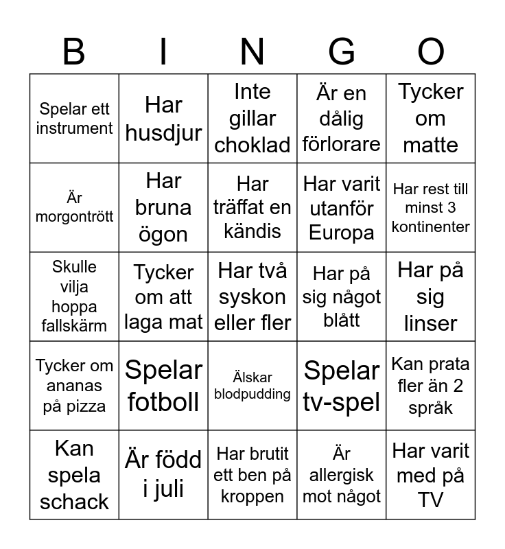 This bingo card has a free space and 24 words: Spelar fotboll, Är född i juli, Har träffat en kändis, Kan spela schack, Tycker om matte, Spelar ett instrument, Är morgontrött, Har husdjur, Har på sig något blått, Älskar blodpudding, Har varit utanför Europa, Skulle vilja hoppa fallskärm, Spelar tv-spel, Kan prata fler än 2 språk, Har bruna ögon, Är allergisk mot något, Har på sig linser, Inte gillar choklad, Har rest till minst 3 kontinenter, Tycker om att laga mat, Har varit med på TV, Tycker om ananas på pizza, Är en dålig förlorare and Har brutit ett ben på kroppen.