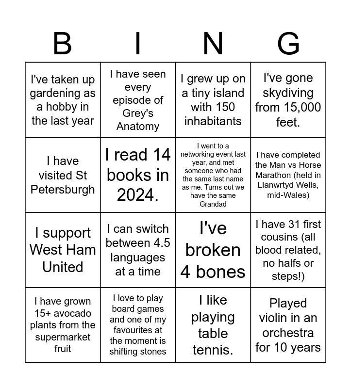 This bingo card has 16 words: I love to play board games and one of my favourites at the moment is shifting stones, I have 31 first cousins (all blood related, no halfs or steps!), I grew up on a tiny island with 150 inhabitants, I've taken up gardening as a hobby in the last year, I support West Ham United, I have seen every episode of Grey's Anatomy, I've broken 4 bones, I like playing table tennis., I have visited St Petersburgh, I read 14 books in 2024., I have grown 15+ avocado plants from the supermarket fruit, I've gone skydiving from 15,000 feet., I can switch between 4.5 languages at a time, I have completed the Man vs Horse Marathon (held in Llanwrtyd Wells, mid-Wales), I went to a networking event last year, and met someone who had the same last name as me. Turns out we have the same Grandad and Played violin in an orchestra for 10 years.
