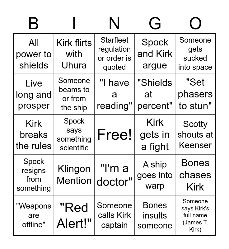 This bingo card has a free space and 24 words: Klingon Mention, "Red Alert!", "I have a reading", "Weapons are offline", Someone gets sucked into space, All power to shields, Live long and prosper, Kirk flirts with Uhura, Kirk gets in a fight, "I'm a doctor", "Shields at __ percent", Kirk breaks the rules, A ship goes into warp, Bones chases Kirk, Someone beams to or from the ship, Bones insults someone, Scotty shouts at Keenser, Starfleet regulation or order is quoted, "Set phasers to stun", Spock says something scientific, Someone says Kirk's full name (James T. Kirk), Spock resigns from something, Spock and Kirk argue and Someone calls Kirk captain.