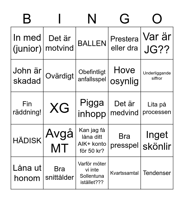 This bingo card has 25 words: Avgå MT, Varför möter vi inte Sollentuna istället???, Obefintligt anfallsspel, Låna ut honom, Var är JG??, In med (junior), John är skadad, Det är motvind, Det är medvind, Kan jag få låna ditt AIK+ konto för 50 kr?, Hove osynlig, Fin räddning!, Bra presspel, Inget skönlir, Ovärdigt, Tendenser, Lita på processen, BALLEN, Underliggande siffror, XG, Pigga inhopp, Bra snittålder, HÄDISK, Prestera eller dra and Kvartssamtal.