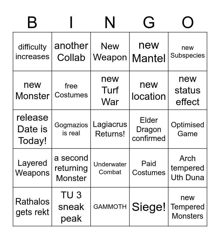 This bingo card has a free space and 24 words: a second returning Monster, TU 3 sneak peak, new Turf War, Rathalos gets rekt, new Subspecies, difficulty increases, new Monster, another Collab, Elder Dragon confirmed, Underwater Combat, new location, release Date is Today!, Paid Costumes, Arch tempered Uth Duna, free Costumes, Siege!, Optimised Game, New Weapon, new status effect, Gogmazios is real, new Tempered Monsters, Layered Weapons, new Mantel and GAMMOTH.
