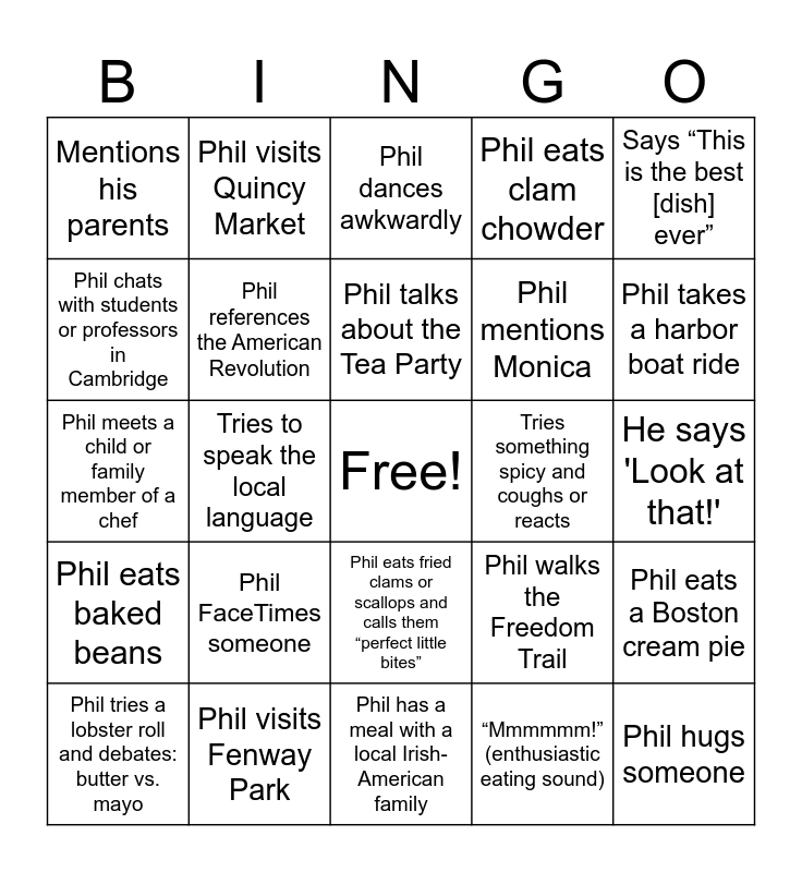 This bingo card has a free space and 29 words: Phil tries a lobster roll and debates: butter vs. mayo, Local says “We love you, Phil!”, Tries to speak the local language, Phil imitates a Boston accent and everyone laughs, Mentions his parents, Phil dances awkwardly, Phil references the American Revolution, Phil FaceTimes someone, Tries something spicy and coughs or reacts, Phil visits Fenway Park, He says 'Look at that!', Phil hugs someone, Phil has a meal with a local Irish-American family, “Mmmmmm!” (enthusiastic eating sound), Phil takes a harbor boat ride, You gotta try this!, Phil eats fried clams or scallops and calls them “perfect little bites”, Phil eats baked beans, Says “This is the best [dish] ever”, Phil meets a child or family member of a chef, Phil walks the Freedom Trail, Phil eats at a Jewish deli and gets nostalgic, Phil mentions Monica, Phil chats with students or professors in Cambridge, Phil eats clam chowder, Phil visits Quincy Market, Phil eats a Boston cream pie, Phil talks about the Tea Party and Phil goes to Harvard or MIT and jokes about how smart everyone is.