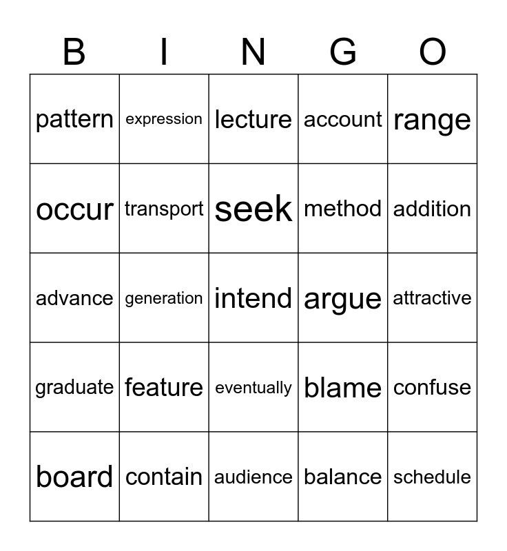 This bingo card has 28 words: confuse, handle, method, balance, occur, lecture, expression, graduate, argue, board, advance, account, contain, audience, addition, detail, feature, transport, seek, eventually, pattern, schedule, intend, generation, attractive, blame, range and worth.
