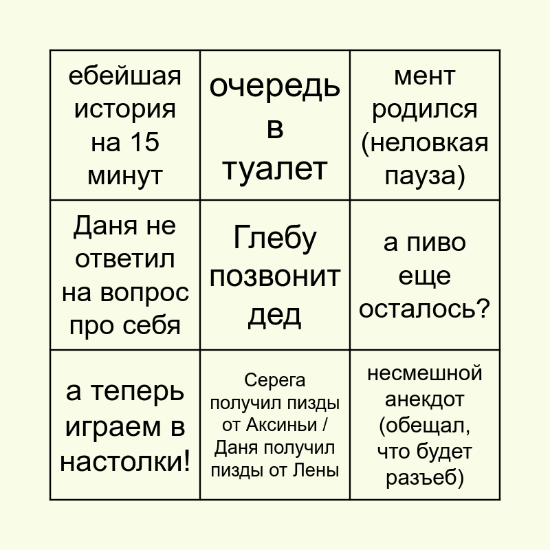 This bingo card has a free space and 11 words: истории про армию, Серега получил пизды от Аксиньи / Даня получил пизды от Лены, несмешной анекдот (обещал, что будет разъеб), а теперь играем в настолки!, очередь в туалет, мент родился (неловкая пауза), а пиво еще осталось?, моя команда победила в квизе, Даня не ответил на вопрос про себя, ебейшая история на 15 минут and у тебя с пина белая.