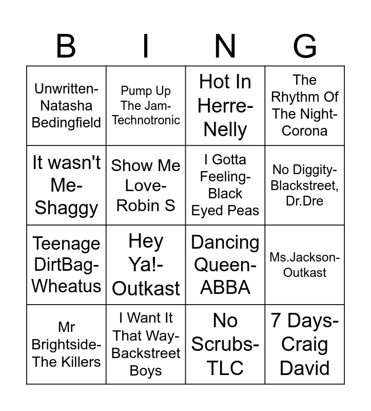 This bingo card has 38 words: Toxic- Britney Spears, Poker Face- Lady Gaga, Miami- Will Smith, I Gotta Feeling- Black Eyed Peas, Party In The Usa- Miley Cyrus, Rock Your Body Justin Timberlake, No Diggity- Blackstreet, Dr.Dre, Song 2- Blur, It wasn't Me- Shaggy, Teenage DirtBag- Wheatus, Ms.Jackson- Outkast, The Rhythm Of The Night- Corona, Mr Brightside- The Killers, No Scrubs- TLC, Show Me Love- Robin S, 7 Days- Craig David, Fireball- Pitbull, Hot In Herre- Nelly, Empire State of Mind- Alicia Keys, Jay Z, I Want It That Way- Backstreet Boys, Unwritten- Natasha Bedingfield, Zombie- The Cranberries, Hey Ya!- Outkast, Jump Around- House Of Pain, Rock DJ- Robbie Williams, Murder On The Dancefloor- Sophie Ellis-Bextor, Keep On Movin'- Five, Hips Don't Lie- Shakira, Crazy In Love- Beyonce, Jay Z, Moves Like Jagger- Marron 5, U Can't Touch This- MC Hammer, Wannabe- Spice Girls, Barbie Girl- Aqua, Pump Up The Jam- Technotronic, Freed From Desire- Gala, Molella, Livin' la Vida Loca- Ricky Martin, Dancing Queen- ABBA and This Love- Maroon 5.
