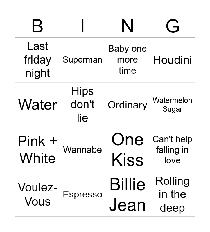 This bingo card has 25 words: Nå koser vi oss, Sørenga, Watermelon Sugar, Hvem er hun, Water, Last friday night, Hips don't lie, Superman, Espresso, Elektrisk, Pink + White, One Kiss, APT, Sigma Boy, Ordinary, Bye, bye, bye, Billie Jean, Baby one more time, Wannabe, Can't help falling in love, Voulez-Vous, Dancing Queen, Rolling in the deep, Houdini and Candy shop.