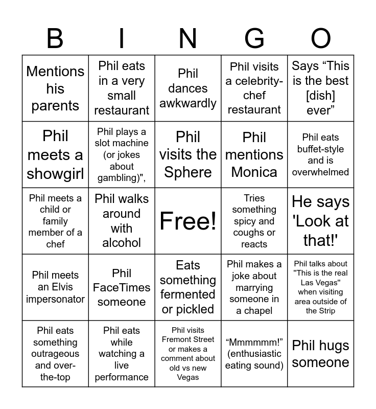 This bingo card has a free space and 29 words: Phil eats something outrageous and over-the-top, Local says “We love you, Phil!”, Phil walks around with alcohol, Phil visits a themed restaurant, Mentions his parents, Phil dances awkwardly, Phil plays a slot machine (or jokes about gambling)",, Phil FaceTimes someone, Tries something spicy and coughs or reacts, Phil eats while watching a live performance, He says 'Look at that!', Phil hugs someone, Phil visits Fremont Street or makes a comment about old vs new Vegas, “Mmmmmm!” (enthusiastic eating sound), Phil eats buffet-style and is overwhelmed, You gotta try this!, Eats something fermented or pickled, Phil meets an Elvis impersonator, Says “This is the best [dish] ever”, Phil meets a child or family member of a chef, Phil makes a joke about marrying someone in a chapel, Tells the chef “You’re amazing”, Phil mentions Monica, Phil meets a showgirl, Phil visits a celebrity-chef restaurant, Phil eats in a very small restaurant, Phil talks about ''This is the real Las Vegas'' when visiting area outside of the Strip, Phil visits the Sphere and Phil visit the Asian neighborhood.