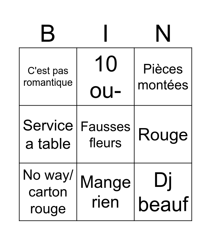 This bingo card has a free space and 8 words: Rouge, Pièces montées, 10 ou-, No way/ carton rouge, C'est pas romantique, Dj beauf, Service a table and Mange rien.