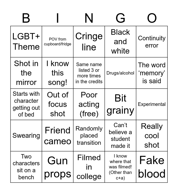 This bingo card has a free space and 30 words: Gun props, Great idea poor execution, Out of focus shot, Emma would love this, LGBT+ Theme, Cringe line, I know this song!, Randomly placed transition, Bit grainy, Filmed in college, Experimental, Fake blood, I know where that was filmed! (Other than c+a), Filmed in arbo, The word ‘memory’ is said, Sports theme, Can’t believe a student made it, Swearing, Friend cameo, Continuity error, Starts with character getting out of bed, Flashback sequence, POV from cupboard/fridge, Drugs/alcohol, Shot in the mirror, Black and white, Really cool shot, Two characters sit on a bench, Same name listed 3 or more times in the credits and Actor playing character twice their age.