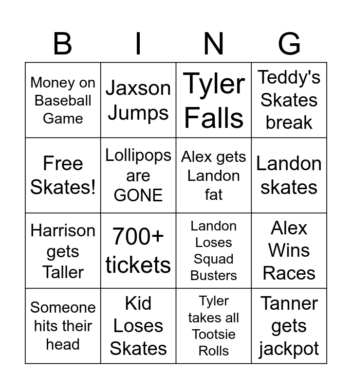 This bingo card has 16 words: Kid Loses Skates, Alex Wins Races, Tyler Falls, Money on Baseball Game, Harrison gets Taller, Jaxson Jumps, Landon Loses Squad Busters, Tyler takes all Tootsie Rolls, Free Skates!, Lollipops are GONE, Someone hits their head, Teddy's Skates break, 700+ tickets, Landon skates, Alex gets Landon fat and Tanner gets jackpot.