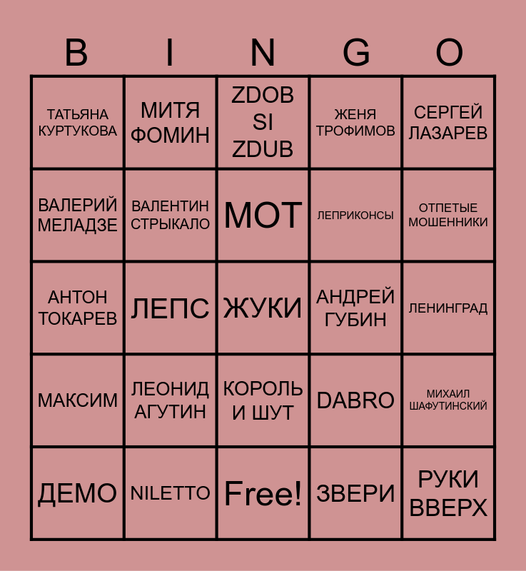 This bingo card has 31 words: Free!, ЛЮСЯ ЧЕБОТИНА, ЛЕПС, ANNA ASTI, ТАТЬЯНА КУРТУКОВА, ZDOB SI ZDUB, ВАЛЕНТИН СТРЫКАЛО, DABRO, АНДРЕЙ ГУБИН, ЗВЕРИ, ЛЕНИНГРАД, ЖУКИ, РУКИ ВВЕРХ, ИВАНУШКИ, ОТПЕТЫЕ МОШЕННИКИ, SLAVA MARLOW, МИХАИЛ ШАФУТИНСКИЙ, ЛЕОНИД АГУТИН, МАКСИМ, КОРОЛЬ И ШУТ, СЕРГЕЙ ЛАЗАРЕВ, ВИРУС, ДЕМО, МИТЯ ФОМИН, ЛЕПРИКОНСЫ, ВАЛЕРИЙ МЕЛАДЗЕ, ЖЕНЯ ТРОФИМОВ, АНТОН ТОКАРЕВ, NILETTO, МОТ and ВАЛЕРИЙ КИПЕЛОВ.