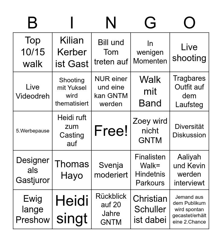 This bingo card has a free space and 29 words: Magdalena ist aus gestiegen, Heidi singt, Bill und Tom treten auf, Leni ist dabei, Live shooting, Top 10/15 walk, Shooting mit Yuksel wird thematisiert, NUR einer und eine kan GNTM werden, Zoey wird nicht GNTM, Aaliyah und Kevin werden interviewt, Ewig lange Preshow, Heidi ruft zum Casting auf, Christian Schuller ist dabei, Jemand aus dem Publikum wird spontan gecastet/erhält eine 2.Chance, 5.Werbepause, Heidi lacht, Rückblick auf 20 Jahre GNTM, Finalisten Walk= Hindetnis Parkours, Tragbares Outfit auf dem Laufsteg, Designer als Gastjuror, Thomas Hayo, Technische Probleme, Walk mit Band, Diversität Diskussion, Live Videodreh, Kilian Kerber ist Gast, Svenja moderiert, In wenigen Momenten and Wann soll msAn DAS TRAGEN?.