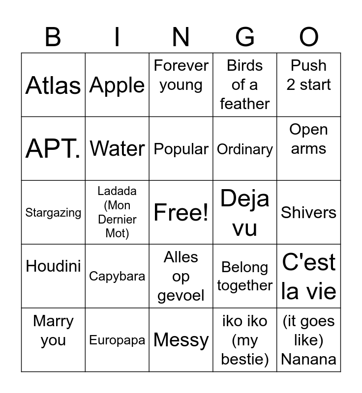 This bingo card has a free space and 24 words: Capybara, Europapa, Popular, Marry you, Push 2 start, Atlas, APT., Apple, Deja vu, Alles op gevoel, Ordinary, Stargazing, Belong together, C'est la vie, Water, iko iko (my bestie), Shivers, Forever young, Open arms, Ladada (Mon Dernier Mot), (it goes like) Nanana, Houdini, Birds of a feather and Messy.