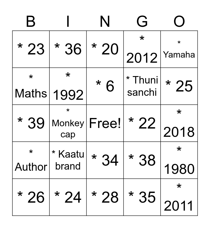 This bingo card has a free space and 38 words: * 1955, * 350, * 1978, * 1992, * 1980, * Kaatu brand, * 6, * Stone, * Yamaha, * Thuni sanchi, * Monkey cap, * 2012, * 2011, * 2018, * Maths, * Author, * 19, * 20, * 21, * 22, * 23, * 24, * 25, * 26, * 27, * 28, * 29, * 30, * 31, * 32, * 33, * 34, * 35, * 36, * 37, * 38, * 39 and * 40.