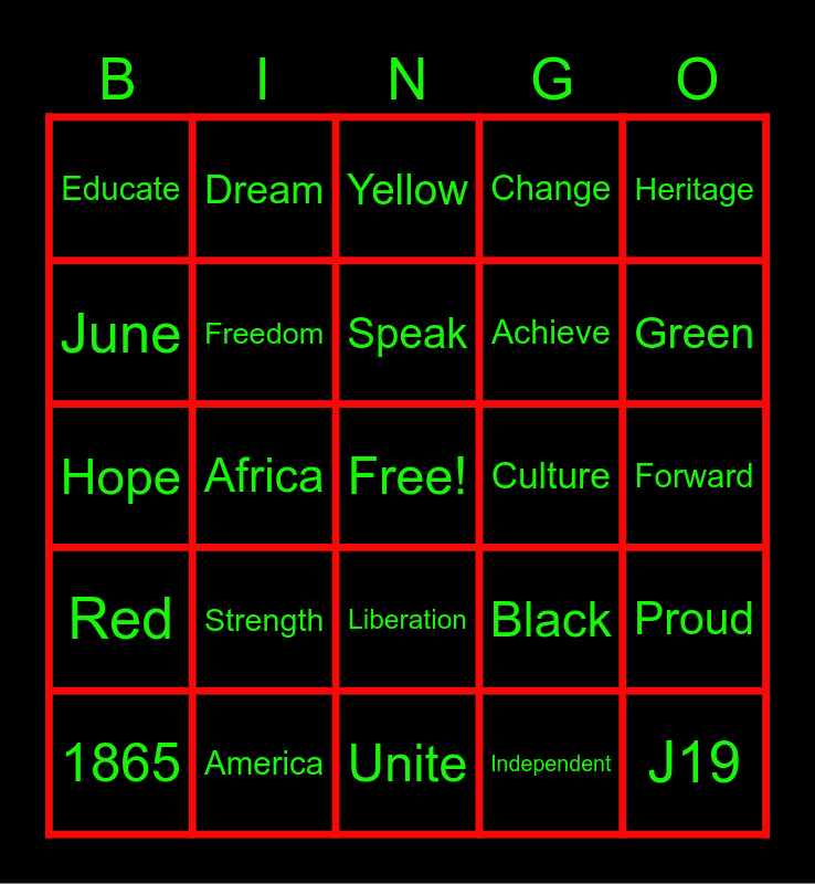 This bingo card has a free space and 24 words: Strength, America, Speak, 1865, Heritage, Educate, June, Dream, Culture, Liberation, Achieve, Hope, Black, Proud, Freedom, Independent, Forward, Yellow, Green, Africa, J19, Red, Change and Unite.