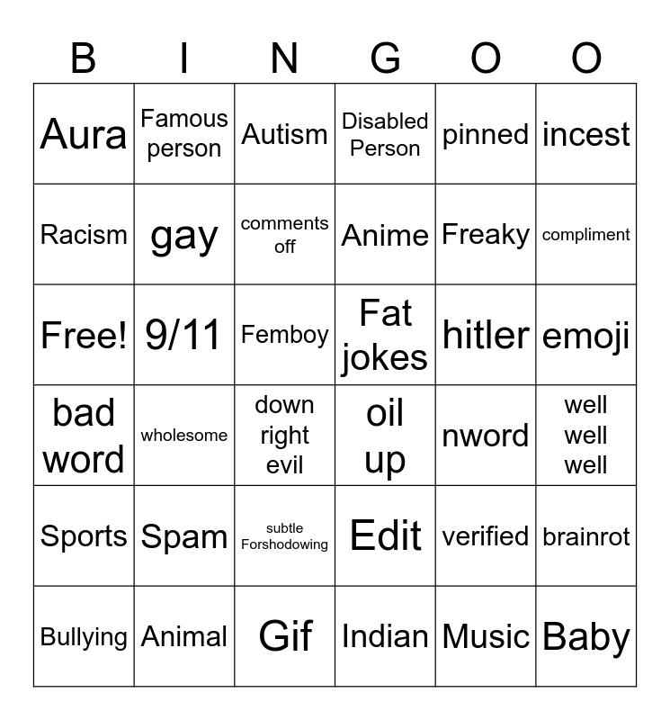 This bingo card has 36 words: Edit, subtle Forshodowing, Indian, Racism, bad word, Fat jokes, gay, Gif, pinned, verified, compliment, Disabled Person, brainrot, 9/11, Anime, Aura, Sports, hitler, Free!, Autism, Femboy, wholesome, oil up, down right evil, nword, Famous person, Freaky, Animal, comments off, incest, Baby, Bullying, well well well, emoji, Spam and Music.