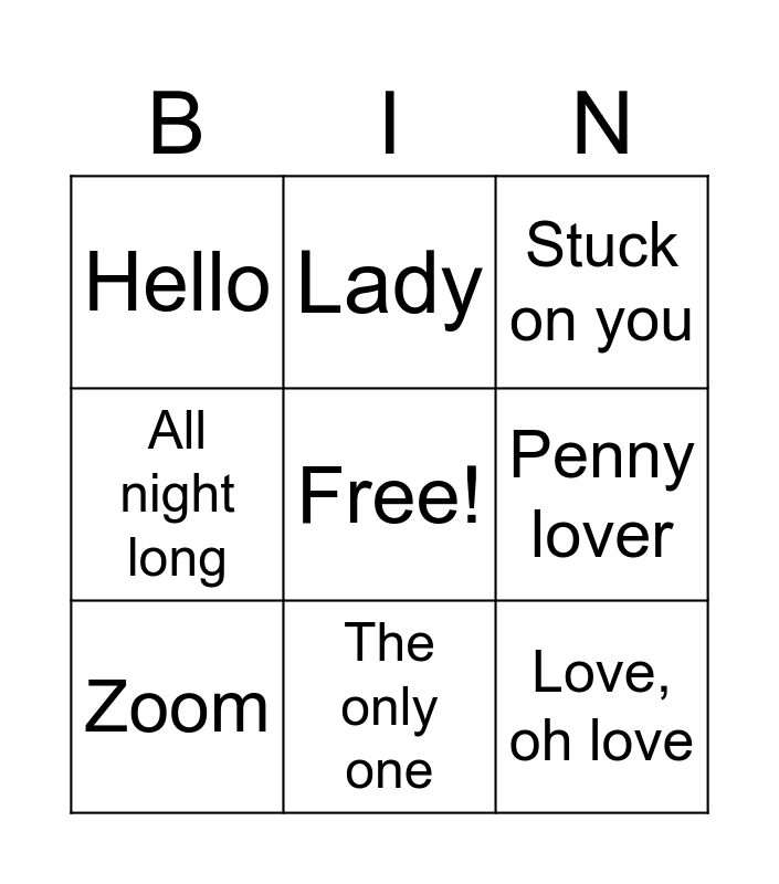 This bingo card has a free space and 18 words: Cant slow down, Say you, say me, Stuck on you, Hello, We are the world, All night long, Dancing on the ceiling, Lady, The only one, Truly, Endless love, Love, oh love, 3 times a lady, Penny lover, Zoom, Easy, Ballerina girl and You are.