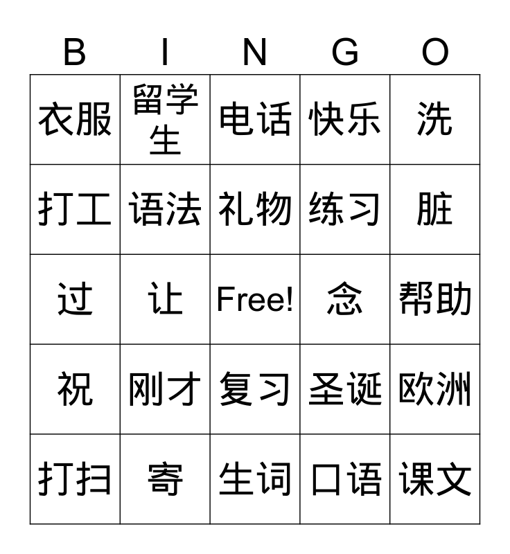 This bingo card has a free space and 24 words: 刚才, 寄, 礼物, 打扫, 洗, 衣服, 打工, 留学生, 念, 复习, 练习, 过, 圣诞, 欧洲, 语法, 口语, 帮助, 电话, 脏, 让, 课文, 祝, 快乐 and 生词.