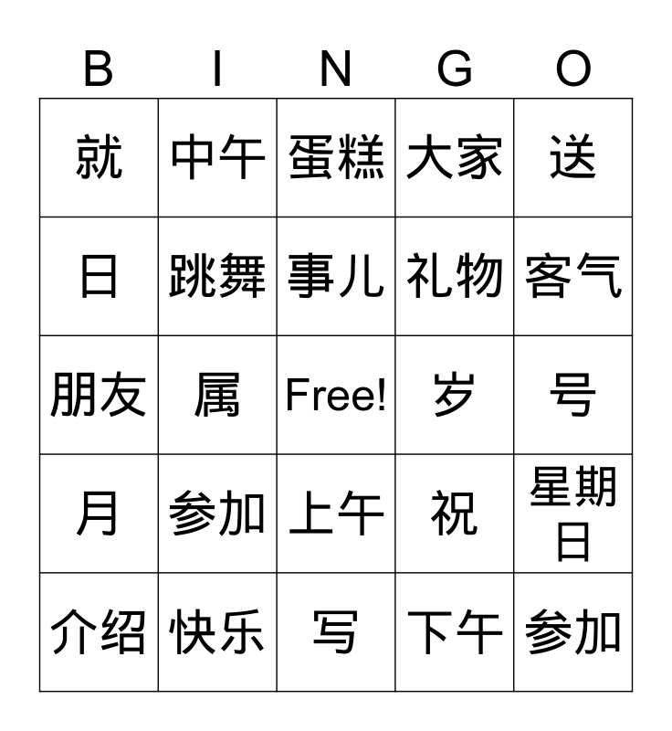 This bingo card has a free space and 38 words: 生日, 聚会, 唱歌, 跳舞, 星期日, 参加, 事儿, 时间, 送, 礼物, 属, 大家, 参加, 号, 日, 月, 年, 蛋糕, 多大, 岁, 就, 快乐, 客气, 介绍, 认知, 写, 汉字, 咱们, 昨天, 今天, 明天, 上午, 下午, 中午, 常常, 祝, 朋友 and 特别.