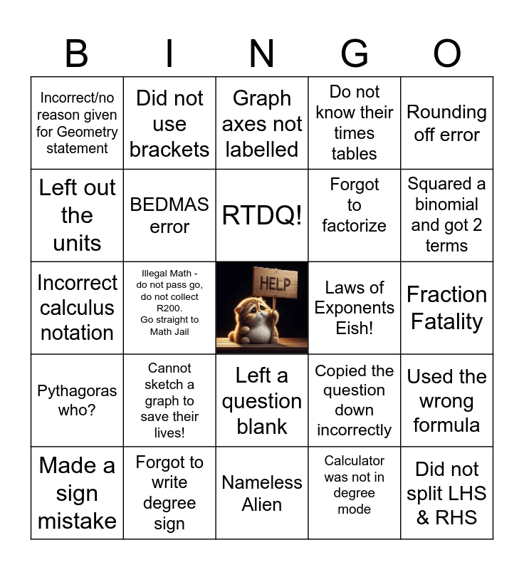 This bingo card has a free space and 24 words: Made a sign mistake, Cannot sketch a graph to save their lives!, RTDQ!, Calculator was not in degree mode, Rounding off error, Incorrect/no reason given for Geometry statement, Did not use brackets, Graph axes not labelled, Laws of Exponents Eish!, Fraction Fatality, Incorrect calculus notation, BEDMAS error, Copied the question down incorrectly, Used the wrong formula, Left out the units, Forgot to write degree sign, Nameless Alien, Do not know their times tables, Squared a binomial and got 2 terms, Pythagoras who?, Illegal Math - do not pass go, do not collect R200. Go straight to Math Jail, Left a question blank, Forgot to factorize and Did not split LHS & RHS.