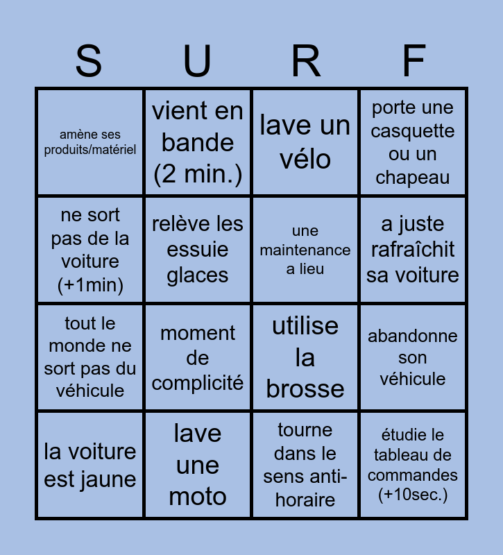 This bingo card has 23 words: parcage en marche arrière, utilise la mousse, utilise la brosse, étudie le tableau de commandes (+10sec.), tout le monde ne sort pas du véhicule, vient en bande (2 min.), lave un vélo, porte une casquette ou un chapeau, la voiture est jaune, lave une moto, tourne dans le sens anti-horaire, a juste rafraîchit sa voiture, une file d'attente se crée, min. 2 personnes dans la cabine, c'est bon mec, elle est propre, y-a-t 'il qqch sur le toit?, amène ses produits/matériel, relève les essuie glaces, une maintenance a lieu, abandonne son véhicule, ne sort pas de la voiture (+1min), moment de complicité and ouvre le coffre.