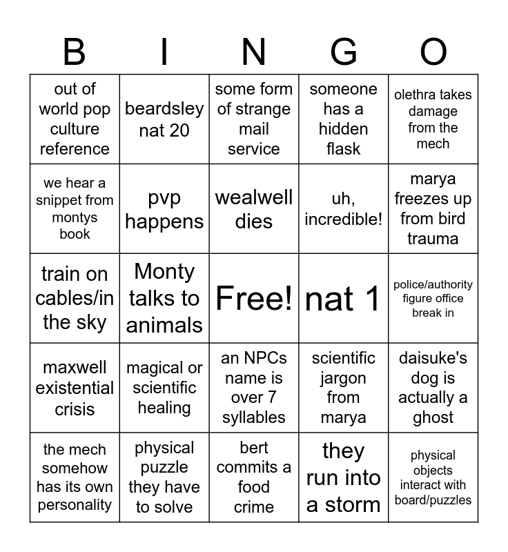 This bingo card has a free space and 24 words: magical or scientific healing, physical puzzle they have to solve, wealwell dies, the mech somehow has its own personality, olethra takes damage from the mech, out of world pop culture reference, we hear a snippet from montys book, beardsley nat 20, nat 1, an NPCs name is over 7 syllables, uh, incredible!, train on cables/in the sky, scientific jargon from marya, daisuke's dog is actually a ghost, pvp happens, they run into a storm, police/authority figure office break in, some form of strange mail service, marya freezes up from bird trauma, Monty talks to animals, physical objects interact with board/puzzles, maxwell existential crisis, someone has a hidden flask and bert commits a food crime.