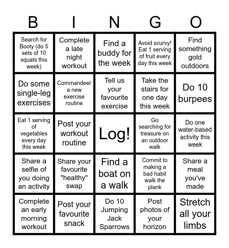 This bingo card has a free space and 31 words: Do 10 Jumping Jack Sparrows, Why's the rum gone? (Complete your hydration goal for the day), Post your workout routine, Show off your flask (waterbottle), Search for Booty (do 5 sets of 10 squats this week), Find a buddy for the week, Commandeer a new exercise routine, Commit to making a bad habit walk the plank, Go searching for treasure on an outdoor walk, Post photos of your horizon, Do one water-based activity this week, Stretch all your limbs, Do a core exercise, Do a 30 second plank, Do 10 burpees, Do some rowing! Prep for the seas., Share a meal you've made, Share your favourite "healthy" swap, Share a selfie of you doing an activity, Find a boat on a walk, Find something gold outdoors, Give us your best "Arrr!", Complete an early morning workout, Complete a late night workout, Take the stairs for one day this week, Do some single-leg exercises, Avoid scurvy! Eat 1 serving of fruit every day this week, Eat 1 serving of vegetables every day this week, Post your favourite snack, Tell us your favourite exercise and Share your challenge goals.