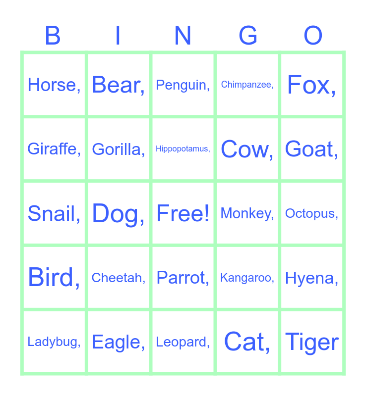 This bingo card has a free space and 50 words: Lion,, Tiger, Elephant, Leopard,, Cheetah,, Wolf,, Bear,, Zebra,, Giraffe,, Rhinoceros,, Gorilla,, Chimpanzee,, Hyena,, Kangaroo,, Koala,, Crocodile,, Hippopotamus,, Monkey,, Deer,, Fox,, Dog,, Cat,, Horse,, Cow,, Pig,, Rabbit,, Goat,, Sheep,, Penguin,, Parrot,, Snake,, Turtle,, Frog,, Owl,, Eagle,, Hawk,, Whale,, Dolphin,, Shark,, Octopus,, Spider,, Ant,, Bee,, Butterfly,, Ladybug,, Snail,, Worm,, Fish,, Bird, and Lizard..