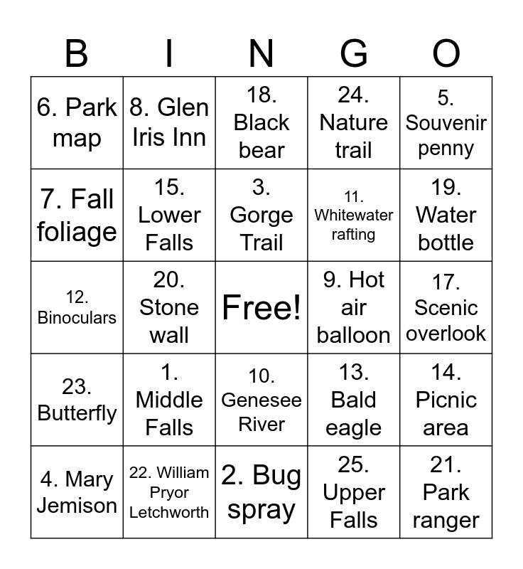 This bingo card has a free space and 25 words: 1. Middle Falls, 2. Bug spray, 3. Gorge Trail, 4. Mary Jemison, 5. Souvenir penny, 6. Park map, 7. Fall foliage, 8. Glen Iris Inn, 9. Hot air balloon, 10. Genesee River, 11. Whitewater rafting, 12. Binoculars, 13. Bald eagle, 14. Picnic area, 15. Lower Falls, 16. Historic marker, 17. Scenic overlook, 18. Black bear, 19. Water bottle, 20. Stone wall, 21. Park ranger, 22. William Pryor Letchworth, 23. Butterfly, 24. Nature trail and 25. Upper Falls.