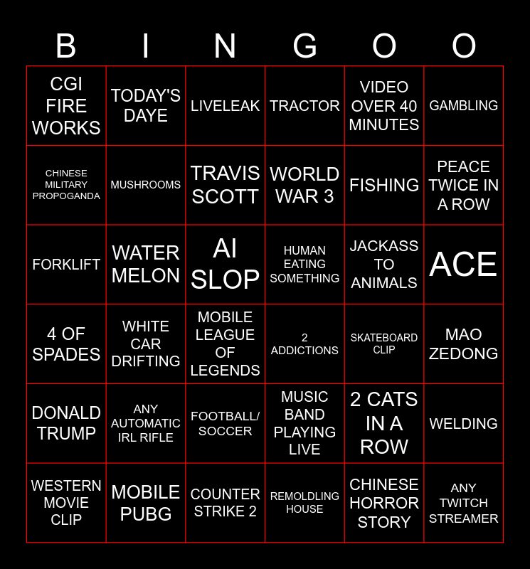 This bingo card has 36 words: MUSIC BAND PLAYING LIVE, FOOTBALL/ SOCCER, REMOLDLING HOUSE, CHINESE MILITARY PROPOGANDA, 4 OF SPADES, HUMAN EATING SOMETHING, MUSHROOMS, COUNTER STRIKE 2, VIDEO OVER 40 MINUTES, 2 CATS IN A ROW, PEACE TWICE IN A ROW, TRACTOR, WELDING, WATER MELON, WORLD WAR 3, CGI FIRE WORKS, DONALD TRUMP, JACKASS TO ANIMALS, FORKLIFT, LIVELEAK, AI SLOP, WHITE CAR DRIFTING, 2 ADDICTIONS, MOBILE LEAGUE OF LEGENDS, SKATEBOARD CLIP, TODAY'S DAYE, FISHING, MOBILE PUBG, TRAVIS SCOTT, GAMBLING, ANY TWITCH STREAMER, WESTERN MOVIE CLIP, MAO ZEDONG, ACE, ANY AUTOMATIC IRL RIFLE and CHINESE HORROR STORY.