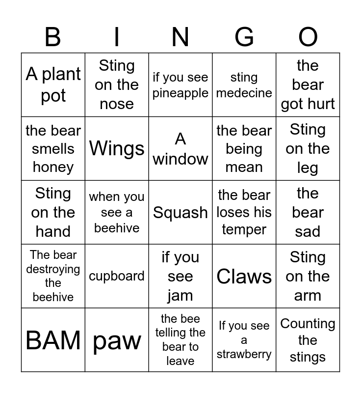 This bingo card has a free space and 24 words: cupboard, paw, A window, BAM, the bear got hurt, A plant pot, the bear smells honey, Sting on the nose, the bear loses his temper, if you see jam, the bear being mean, Sting on the hand, Claws, Sting on the arm, Wings, If you see a strawberry, the bear sad, if you see pineapple, Sting on the leg, when you see a beehive, Counting the stings, The bear destroying the beehive, sting medecine and the bee telling the bear to leave.
