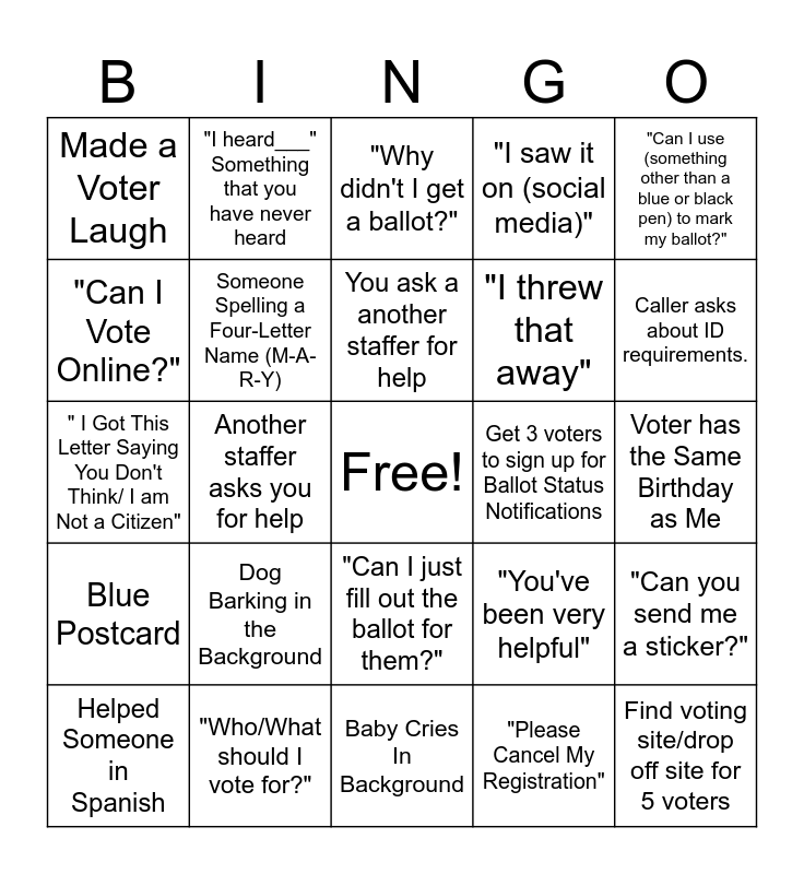 This bingo card has a free space and 24 words: Dog Barking in the Background, "Who/What should I vote for?", You ask a another staffer for help, Helped Someone in Spanish, "Can I use (something other than a blue or black pen) to mark my ballot?", Made a Voter Laugh, "Can I Vote Online?", "I heard___" Something that you have never heard, Get 3 voters to sign up for Ballot Status Notifications, "Can I just fill out the ballot for them?", "I threw that away", " I Got This Letter Saying You Don't Think/ I am Not a Citizen", "You've been very helpful", "Can you send me a sticker?", Someone Spelling a Four-Letter Name (M-A-R-Y), "Please Cancel My Registration", Voter has the Same Birthday as Me, "Why didn't I get a ballot?", Caller asks about ID requirements., Another staffer asks you for help, Find voting site/drop off site for 5 voters, Blue Postcard, "I saw it on (social media)" and Baby Cries In Background.