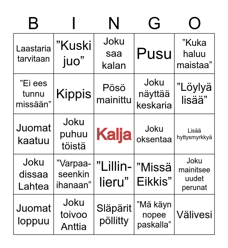 This bingo card has a free space and 24 words: ”Varpaa-seenkin ihanaan”, Joku toivoo Anttia, Pösö mainittu, Juomat loppuu, ”Kuka haluu maistaa”, Laastaria tarvitaan, ”Ei ees tunnu missään”, ”Kuski juo”, Joku oksentaa, ”Lillin-lieru”, Joku näyttää keskaria, Juomat kaatuu, ”Missä Eikkis”, Joku mainitsee uudet perunat, Kippis, ”Mä käyn nopee paskalla”, Lisää hyttysmyrkkyä, Joku saa kalan, ”Löylyä lisää”, Joku puhuu töistä, Välivesi, Joku dissaa Lahtea, Pusu and Släpärit pöllitty.