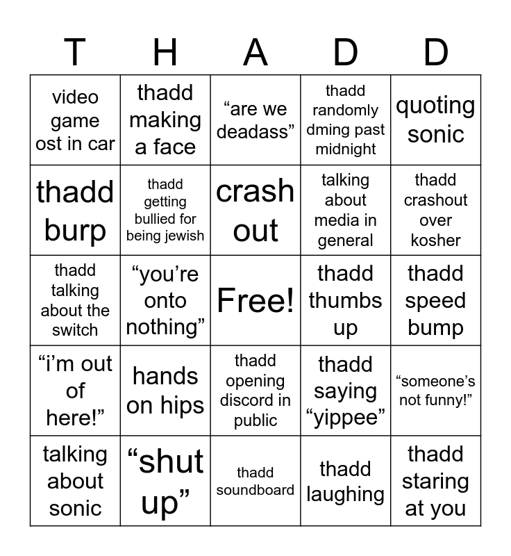 This bingo card has a free space and 24 words: hands on hips, “shut up”, crash out, talking about sonic, quoting sonic, video game ost in car, thadd burp, thadd making a face, thadd thumbs up, thadd opening discord in public, talking about media in general, thadd talking about the switch, thadd saying “yippee”, “someone’s not funny!”, thadd getting bullied for being jewish, thadd laughing, thadd speed bump, “are we deadass”, thadd crashout over kosher, “you’re onto nothing”, thadd staring at you, “i’m out of here!”, thadd randomly dming past midnight and thadd soundboard.