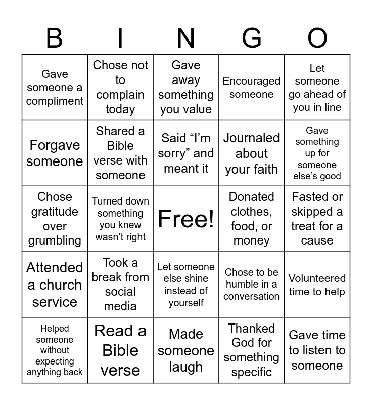 This bingo card has a free space and 60 words: Prayed today, Read a Bible verse, Spent time in silence with God, Attended a church service, Thanked God for something specific, Sang or listened to worship music, Shared a Bible verse with someone, Asked God for guidance today, Journaled about your faith, Read a devotional, Encouraged someone, Helped a friend without being asked, Forgave someone, Smiled at someone who looked sad, Called or messaged someone to check in, Gave someone a compliment, Gave time to listen to someone, Let someone go ahead of you in line, Chose to be kind when it was hard, Said “I’m sorry” and meant it, Donated clothes, food, or money, Gave away something you value, Helped someone without expecting anything back, Volunteered time to help, Shared food or snacks with someone, Paid for someone else, Did a good deed in secret, Shared what you had with someone in need, Gave something up for someone else’s good, Left a kind note or message for someone, Told the truth even when it was hard, Did the right thing even when no one was looking, Chose to stay calm in a stressful moment, Didn’t gossip when you had the chance, Chose not to complain today, Controlled your temper, Admitted a mistake, Turned down something you knew wasn’t right, Encouraged someone else’s success, Chose gratitude over grumbling, Decluttered something you didn’t need, Took a break from social media, Fasted or skipped a treat for a cause, Gave someone the benefit of the doubt, Chose to be humble in a conversation, Didn't post to brag, Let go of something you were holding onto, Chose peace over being right, Prayed for someone you don’t like, Let someone else shine instead of yourself, Made someone laugh, Danced or sang for joy, Thanked God for something small, Saw something in nature and felt awe, Told someone “God bless you” today, Laughed with friends or family, Shared a good memory with someone, Woke up feeling grateful, Took a deep breath and said a short prayer and Felt peace after prayer.