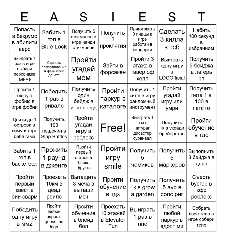 This bingo card has a free space and 48 words: Получить 1к в grow a garden, Выиграть одну игру в LOCOfficial, Проехать 10 этажей в Elevator Fun, Получить 100 пощечин в Slap Battles, Получить один бейдж в игре поезд, Пройти обучение в тдс, Забить 1 гол в Blue Lock, Пройти любой опрос в guess the logo, Сделать 3 килла в тсб, Пройти игру smile, Набить 100 секунд в избранном, Получить 3 проклятия, Пройти угадай игру или умри, Получить 1 килл в игру рандомный инструмент, Пройти первый квест в бии сварм, Получить 1к в укради брейнротов, Выиграть 1 раз в игре выбери персонажа аниме, Получить 3 бейджа в лагерь рп, Получить 5 аур в солс рнг, Приготовить 3 пиццы в игре работай в пиццерии, Пройти 3 этажа в тавер оф хелл, Пройти угадай игру в роблокс, Попасть в бекрумс в абилити варс, Сделать пожертвование в фейк плис донате, Съесть бургер в кфс роблокс, Пройти угадай мем, Получить пета 1 в 100 в петс го, Победить одну игру в мм2, Пройти паркур в каталоге, Победить 1 раз в ривалс, Пройти любой паркур в адопт ми, Выиграть 1 раз в натурал дисастер сурвивал, Выполнить 3 бейджа в дорс, Проехать 10км в деад реилс, Дойти до 1 острова в симуляторе бабл гама, Получить 5 чомиков, Получить 5 маркеров, Пройти 1 любую фобию в игре фобии, Пройти первый остров в блокс фруктс, Вытащить 3 меча в вытащи меч, Забить 1 гол в баскетбол, Собрать свое тело в игре собери тело, Получить 5 стикманов в игре найди стикманов, Пройти обучение в блейд бол, Зайти в форсакен, Пройти обучение в тдх, Прожить 1 раунд в дженге and Выиграть 1 раз в нпс.