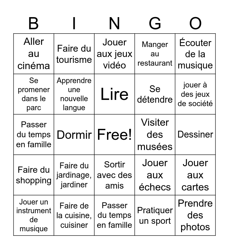 This bingo card has a free space and 24 words: Faire du jardinage, jardiner, Faire de la cuisine, cuisiner, Lire, Jouer un instrument de musique, Écouter de la musique, Aller au cinéma, Se promener dans le parc, Faire du tourisme, Visiter des musées, Sortir avec des amis, Se détendre, Passer du temps en famille, Jouer aux échecs, Jouer aux cartes, Apprendre une nouvelle langue, Pratiquer un sport, Dessiner, Jouer aux jeux vidéo, jouer à des jeux de société, Dormir, Prendre des photos, Faire du shopping, Manger au restaurant and Passer du temps en famille.