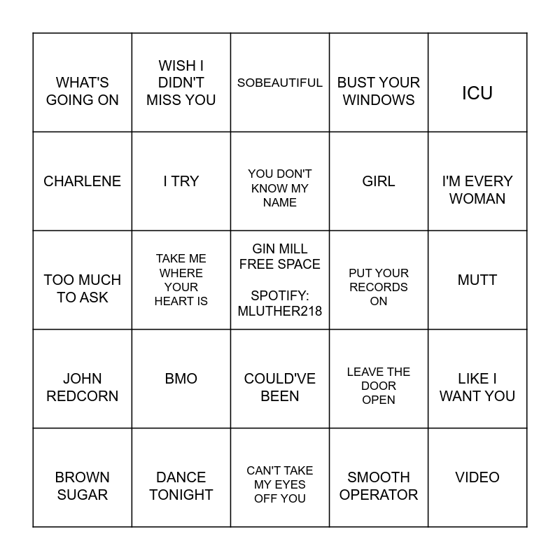 This bingo card has a free space and 51 words: GOLDEN, VIDEO, ON & ON, CAN'T TAKE MY EYES OFF YOU, BMO, LIFE WILL BE, WISH I DIDN'T MISS YOU, PRETTY WINGS, CHARLENE, ORDINARY PEOPLE, I TRY, BUST YOUR WINDOWS, LIKE I WANT YOU, LEAVE THE DOOR OPEN, LOSE CONTROL, FLOETIC, YOU DON'T KNOW MY NAME, PUT YOUR RECORDS ON, HEAVENLY, ICU, TAKE ME WHERE YOUR HEART IS, SMOOTH OPERATOR, WHAT'S GOING ON, GIRL, RIVER, I NEED A DOLLAR, I'M EVERY WOMAN, COLORS, BROWN SUGAR, SOBEAUTIFUL, TELL ME, AT YOUR BEST (YOU ARE LOVE), ROSE ROUGE, I WANT YOU AROUND, GONNA LOVE ME, DANCE TONIGHT, GET YOU, U KNOW WHAT'S UP, DRIVE & DISCONNECT, WE MIGHT EVEN BE FALLING IN LOVE, MUTT, JOHN REDCORN, (SITTIN' ON) THE DOCK OF THE BAY, PINK + WHITE, JERICHO, HOW MUCH CAN A HEART TAKE, TOO MUCH TO ASK, FREE MIND, ETERNAL LIGHT, COULD'VE BEEN and TADOW.