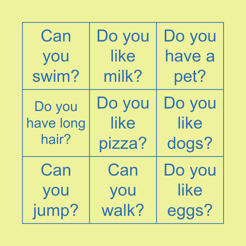 This bingo card has 9 words: Can you jump?, Do you like pizza?, Do you have a pet?, Can you swim?, Do you like milk?, Do you like dogs?, Do you have long hair?, Can you walk? and Do you like eggs?.
